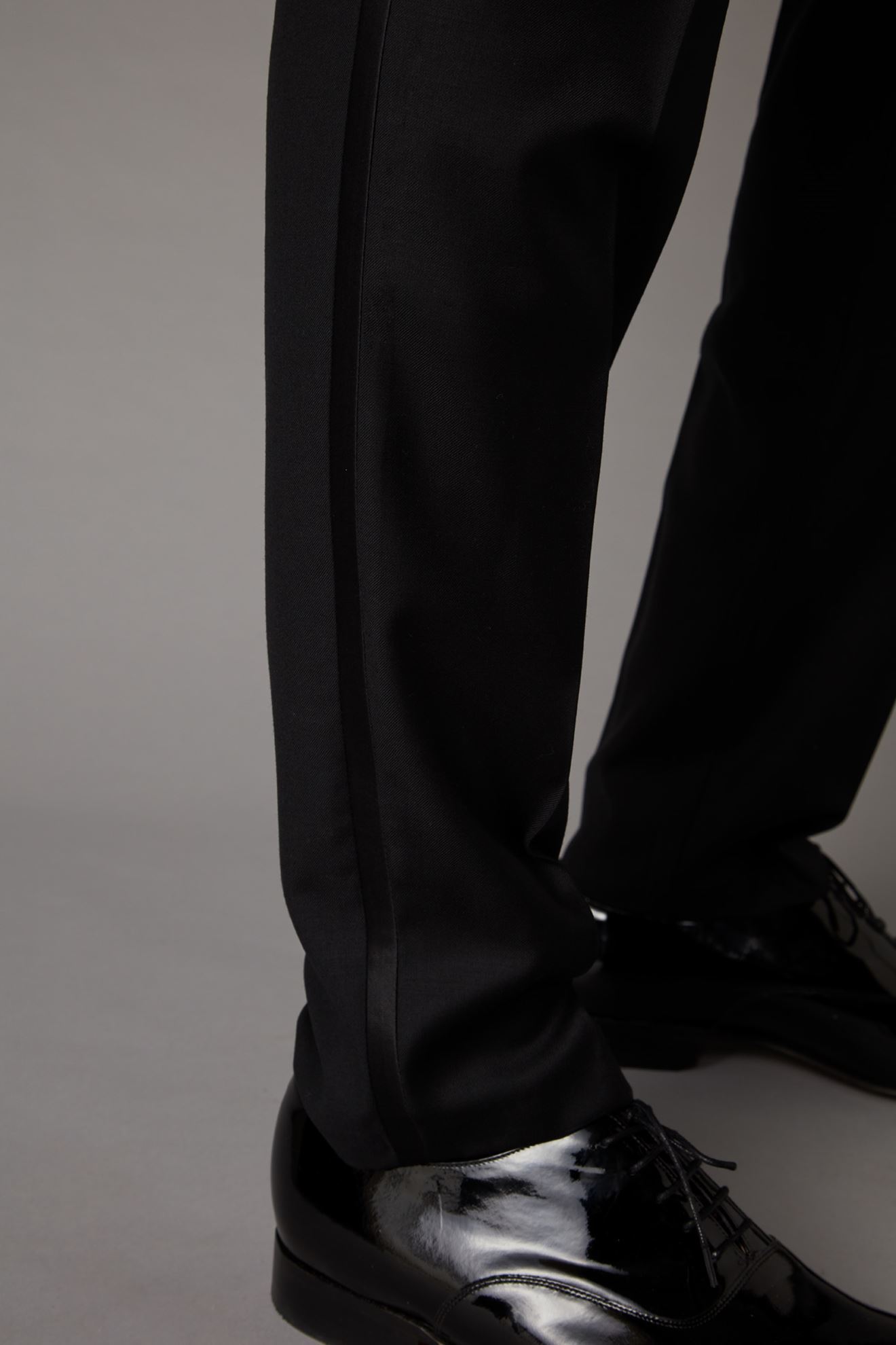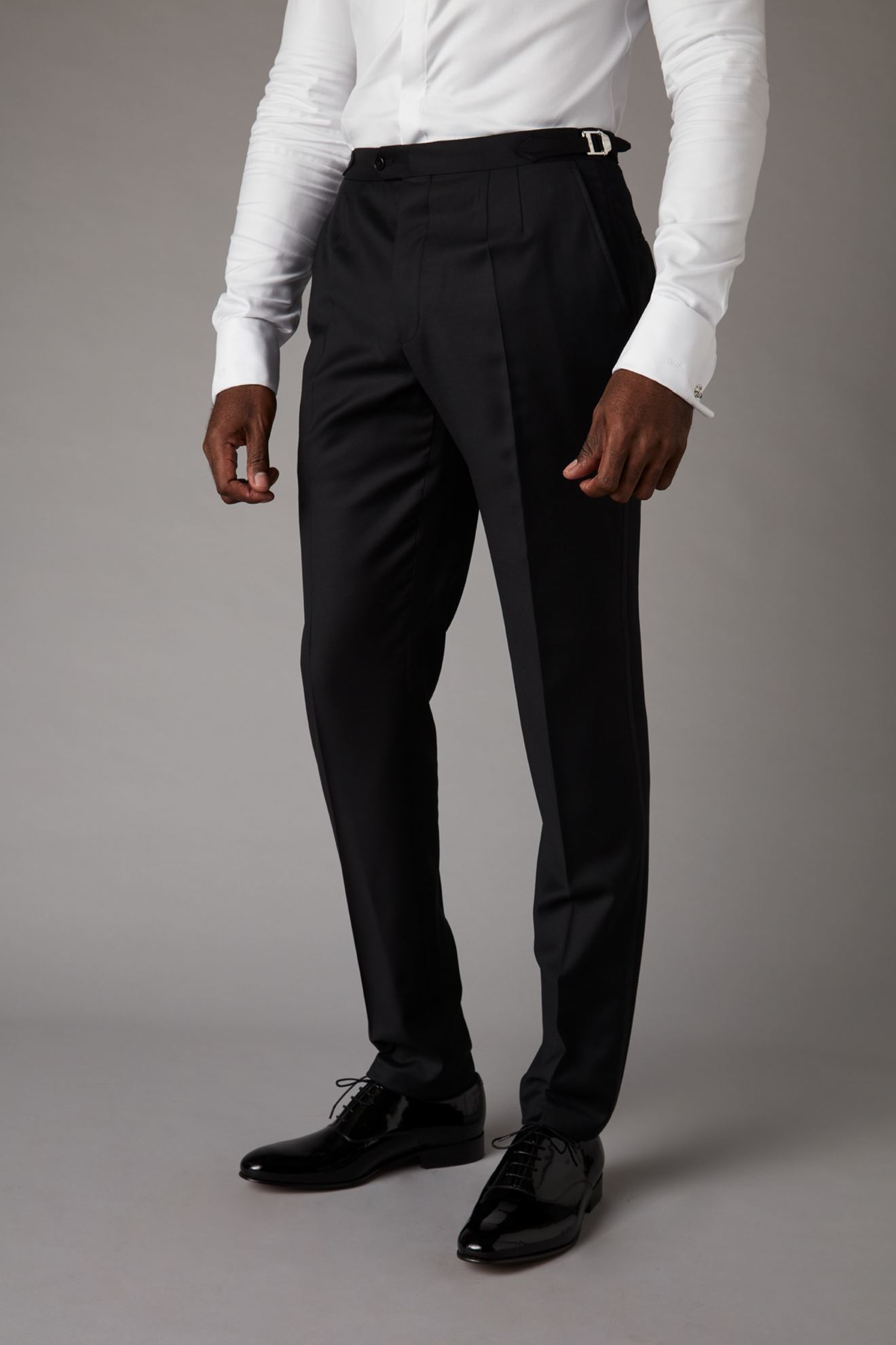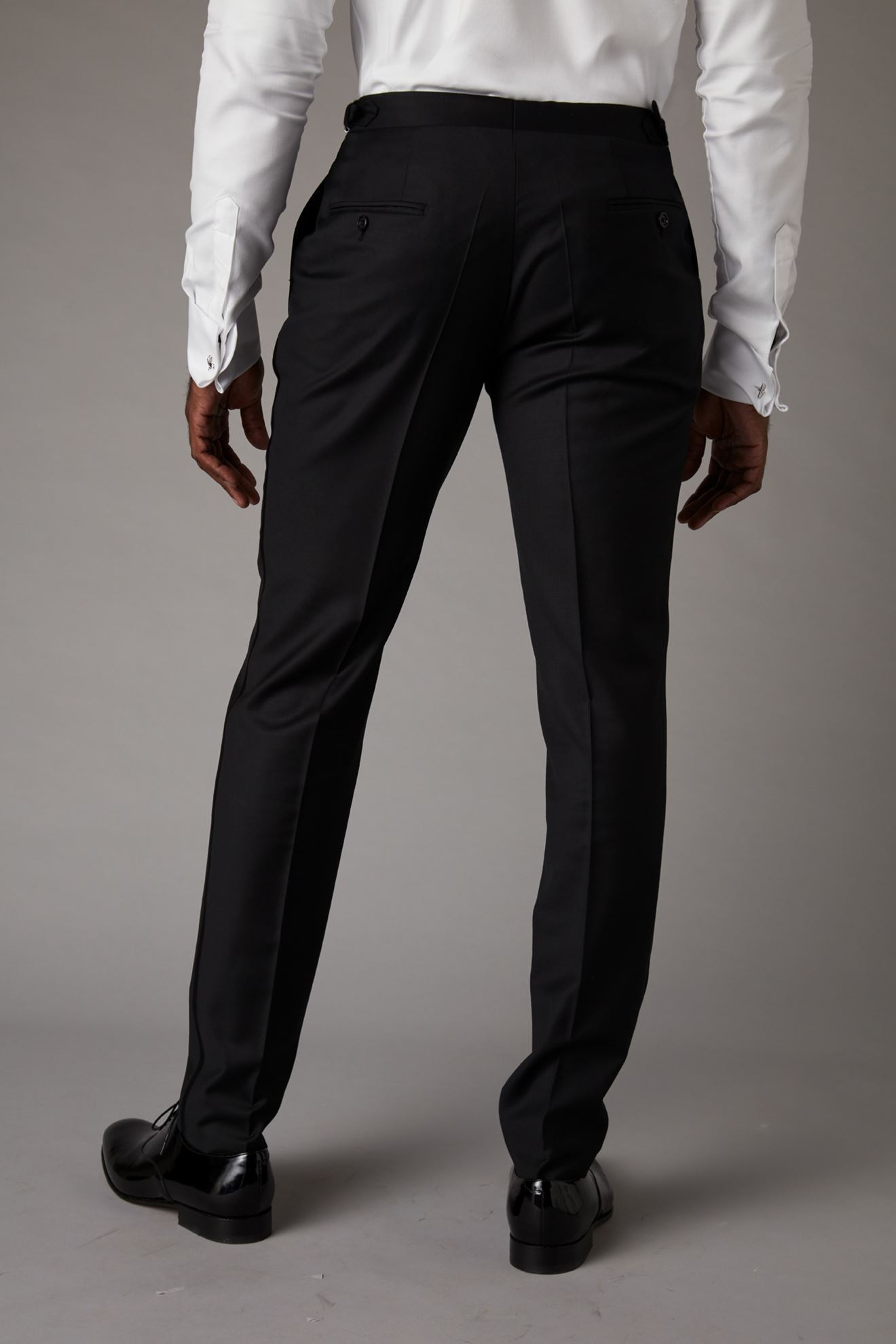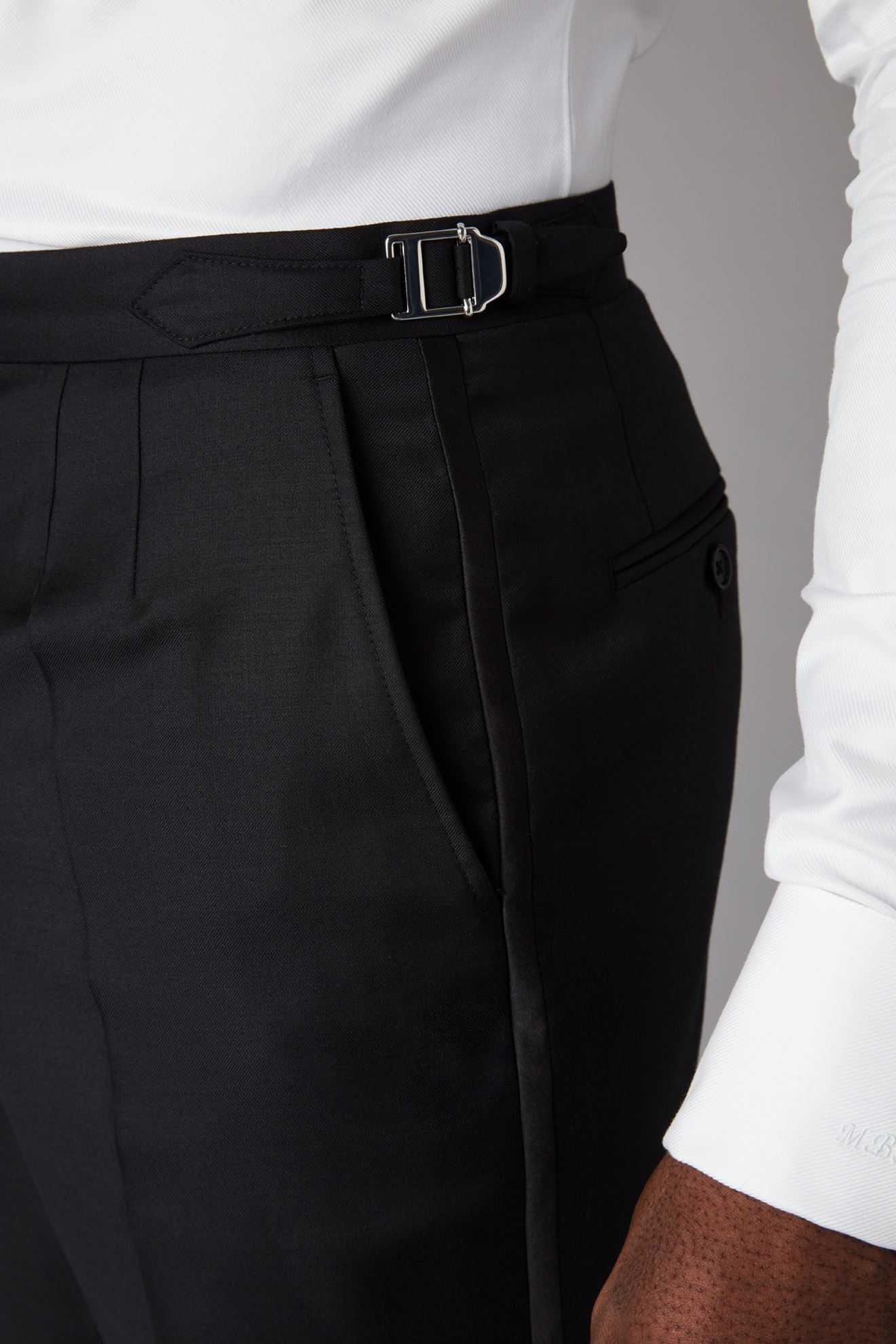 black tux trousers finished with silver buckle side adjusters for that great fit.