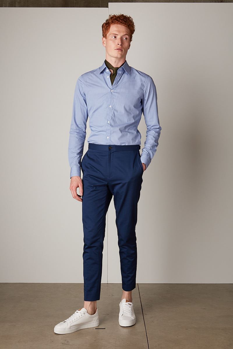 Our key customisations are collar style, embroidery on your cuff and fit. Absolutely anything you like about the chinos is customisable - feel free to drop us a message if you've got something in mind!