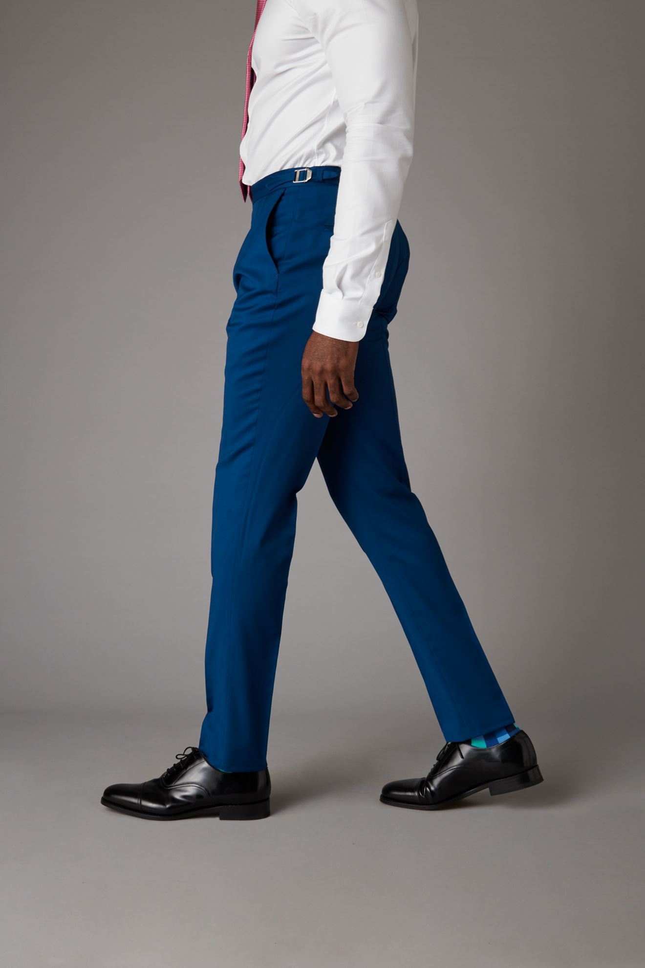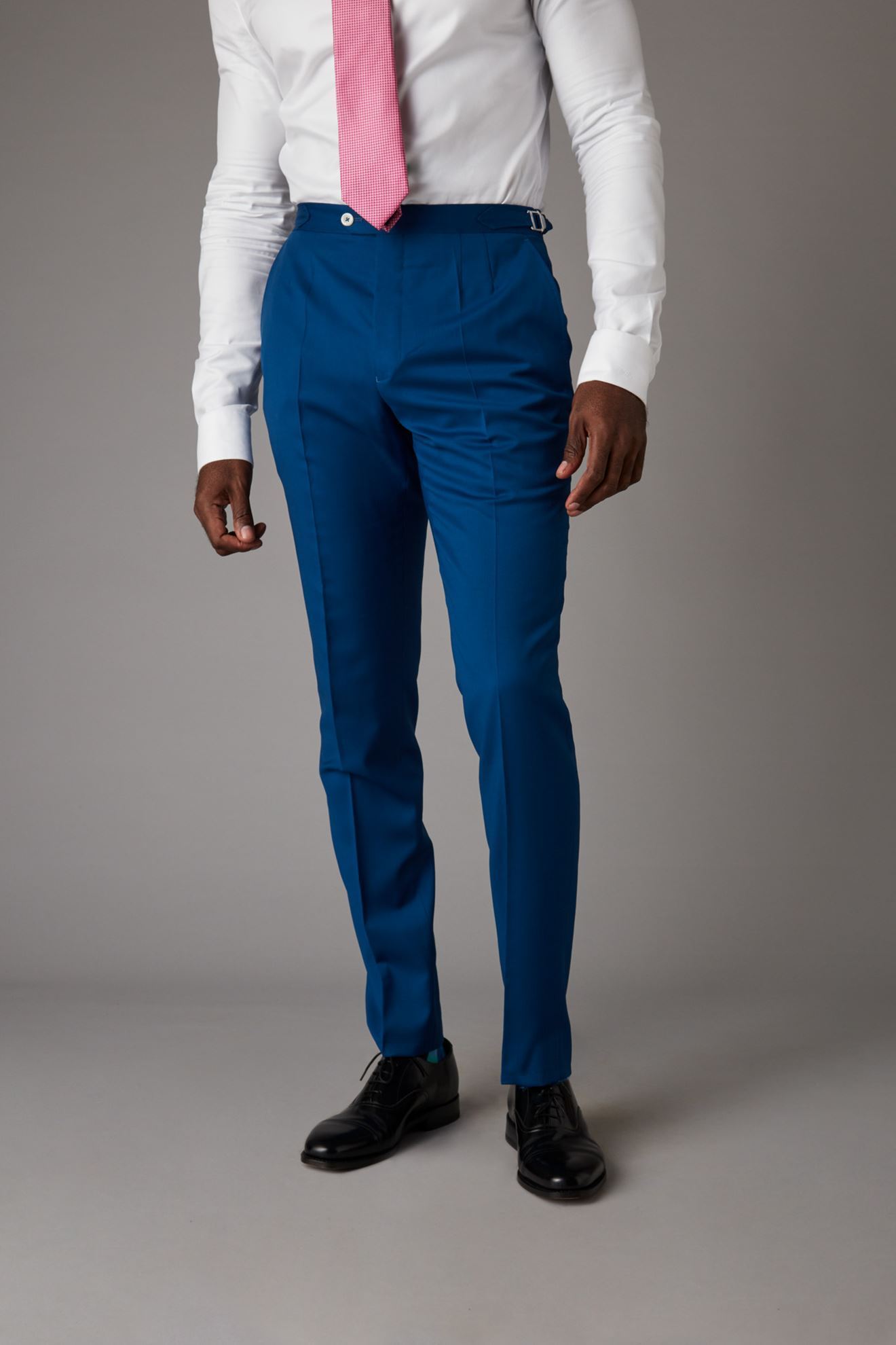 Blue trousers finished with silver buckle side adjusters for that great fit.
