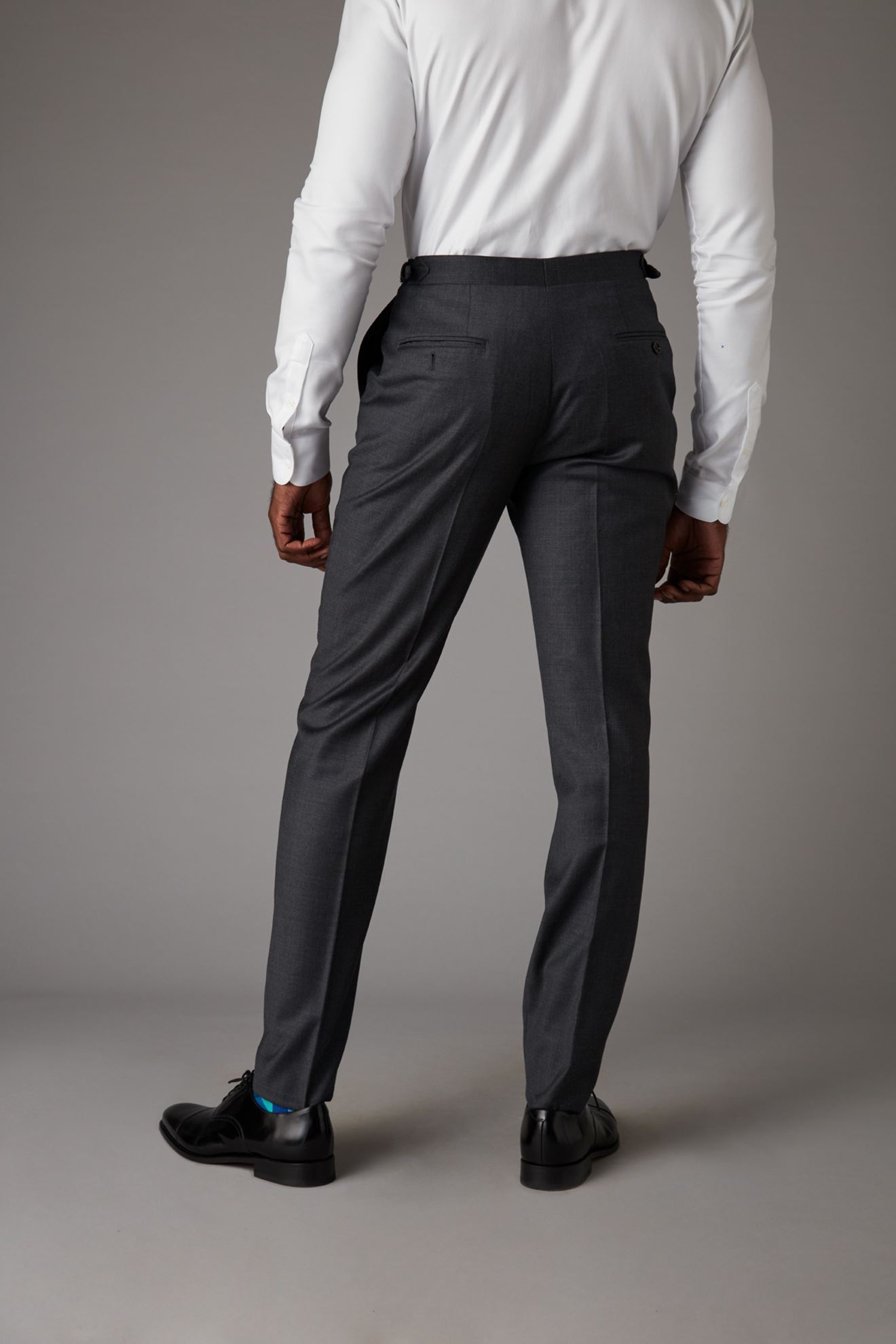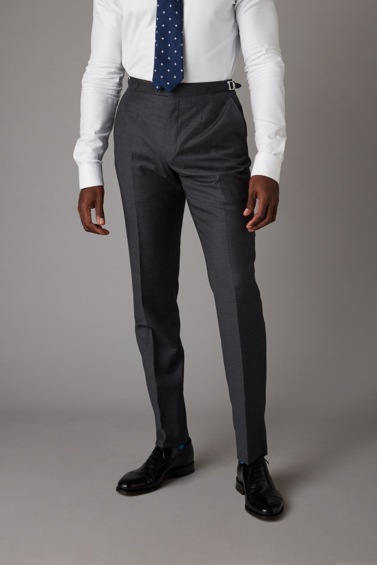 Charcoal grey trousers finished with silver buckle side adjusters for that great fit.