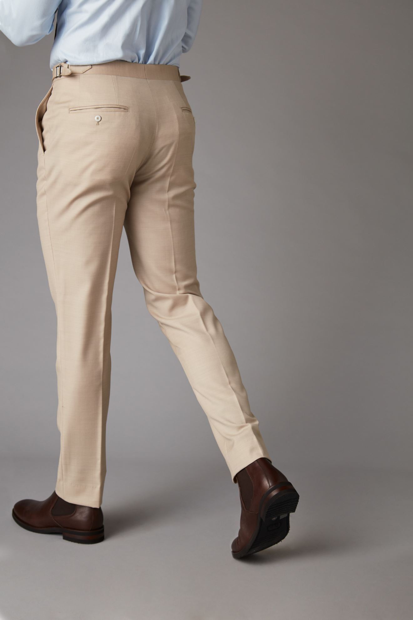 Cream 100% wool trousers finished with silver buckle side adjusters for that great fit.