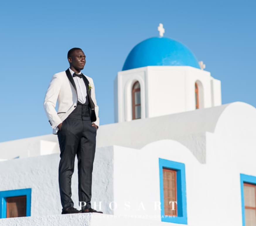 The Drop made Barry an awesome black and white tux for his wedding in Santorini. Buy from The Drop and look like a God!