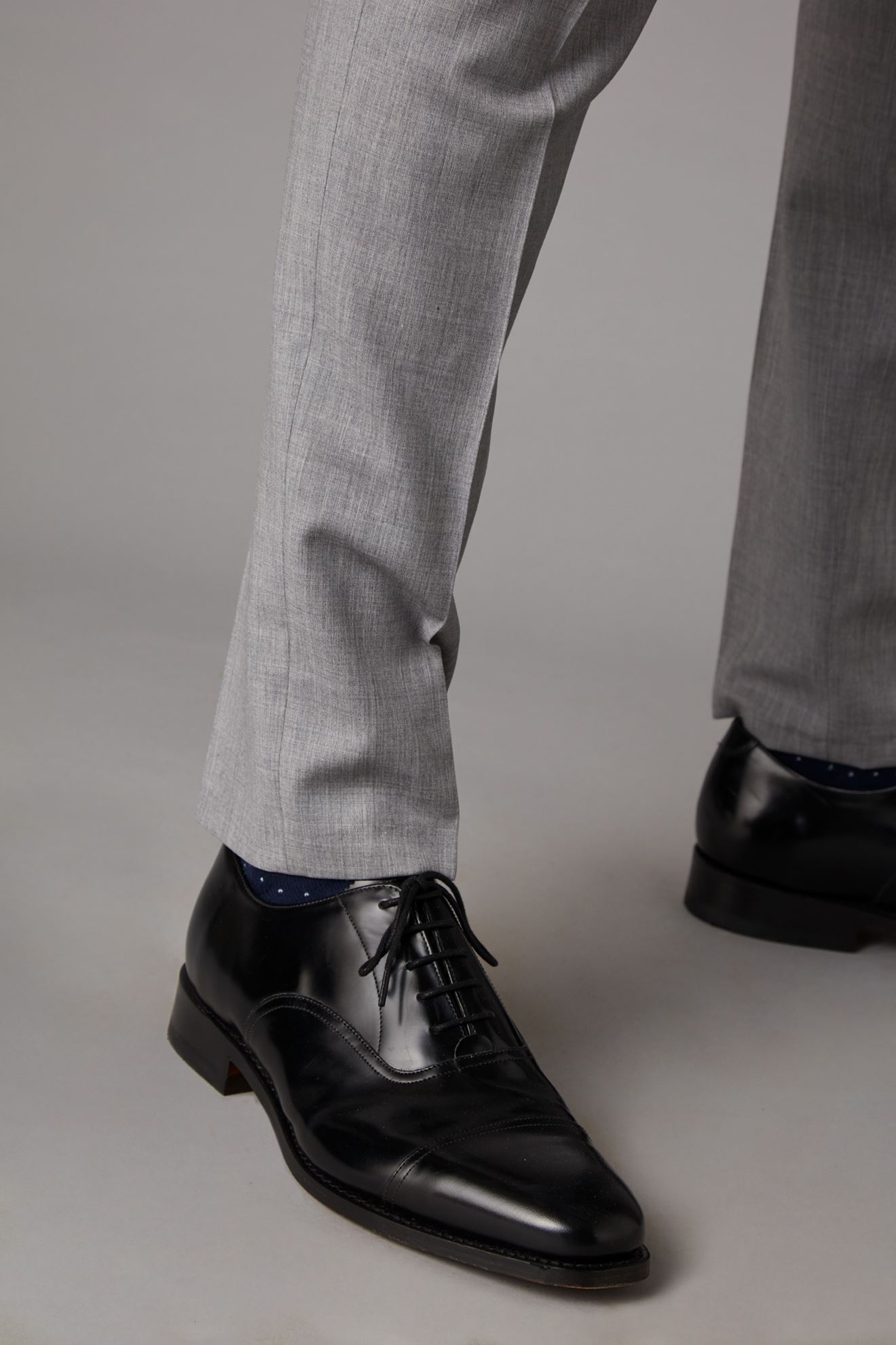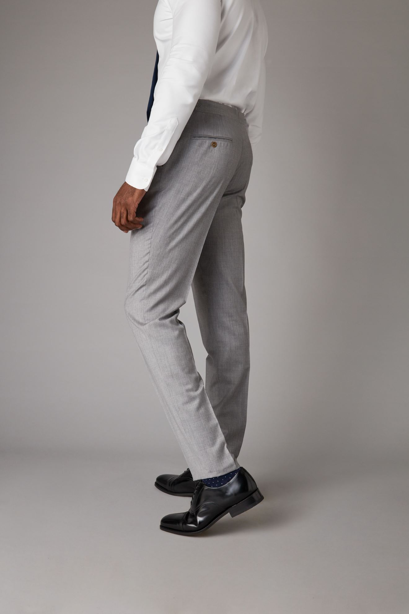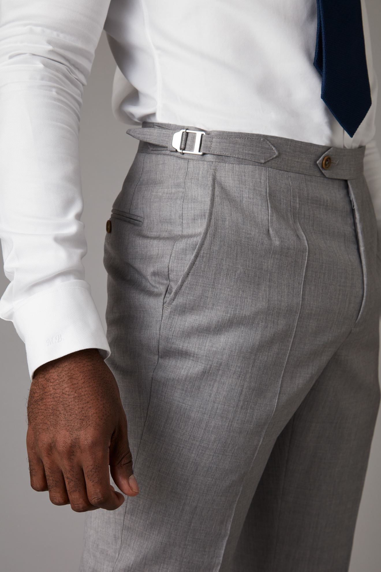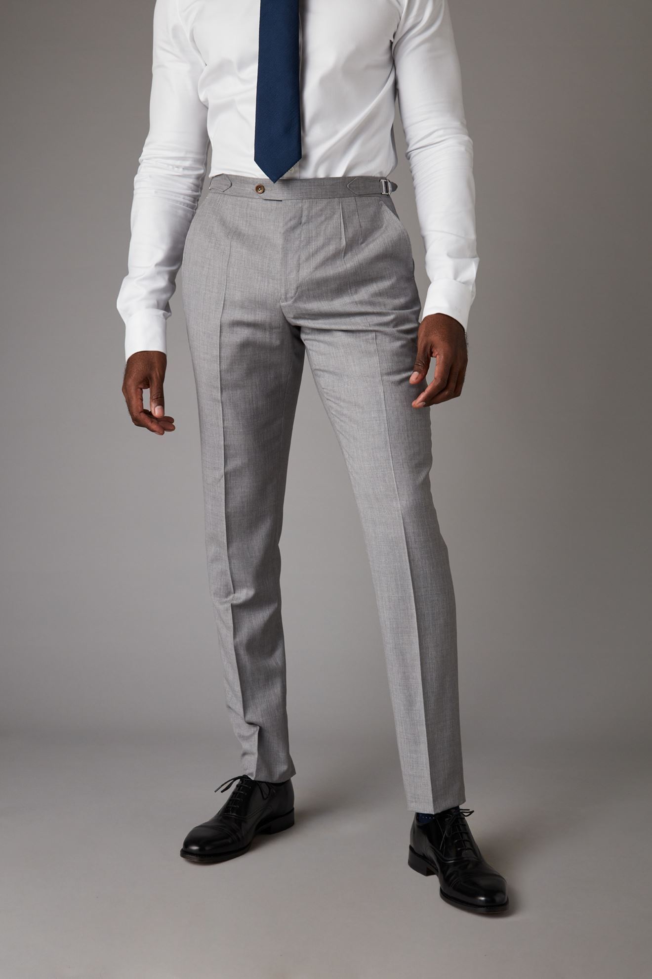 Classic grey trousers finished with silver buckle side adjusters for that great fit.