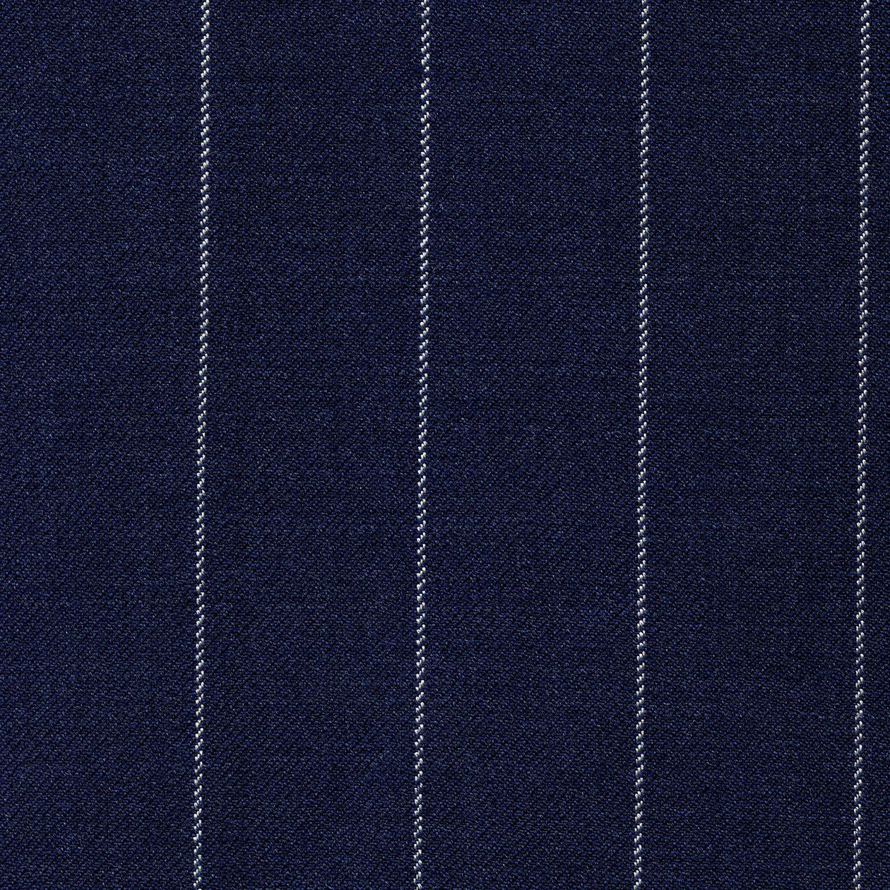 Navy blue pin-striped, double-breasted suit with white horn buttons and slim peak lapel. Good all year round but ideal for a weekend break in Monaco ;...