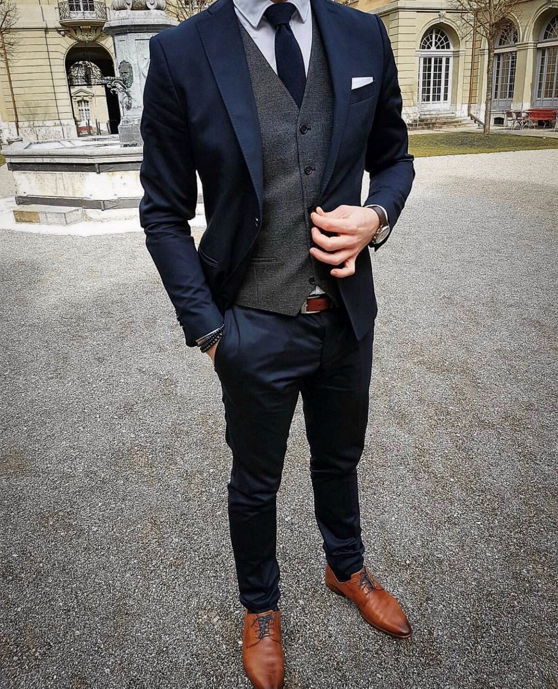 Slim fit single breasted jacket & trousers, with a dark grey waistcoat. Complete this look with a matching navy tie, and brown shoes. This suit is mad...