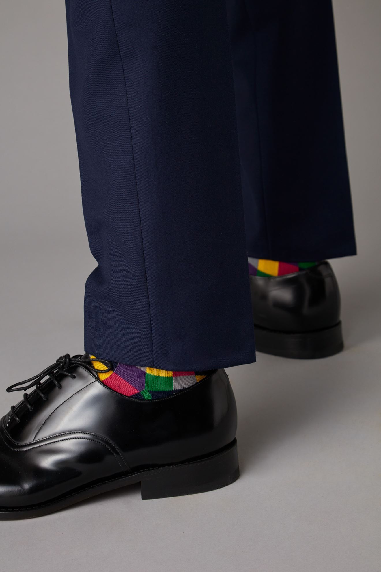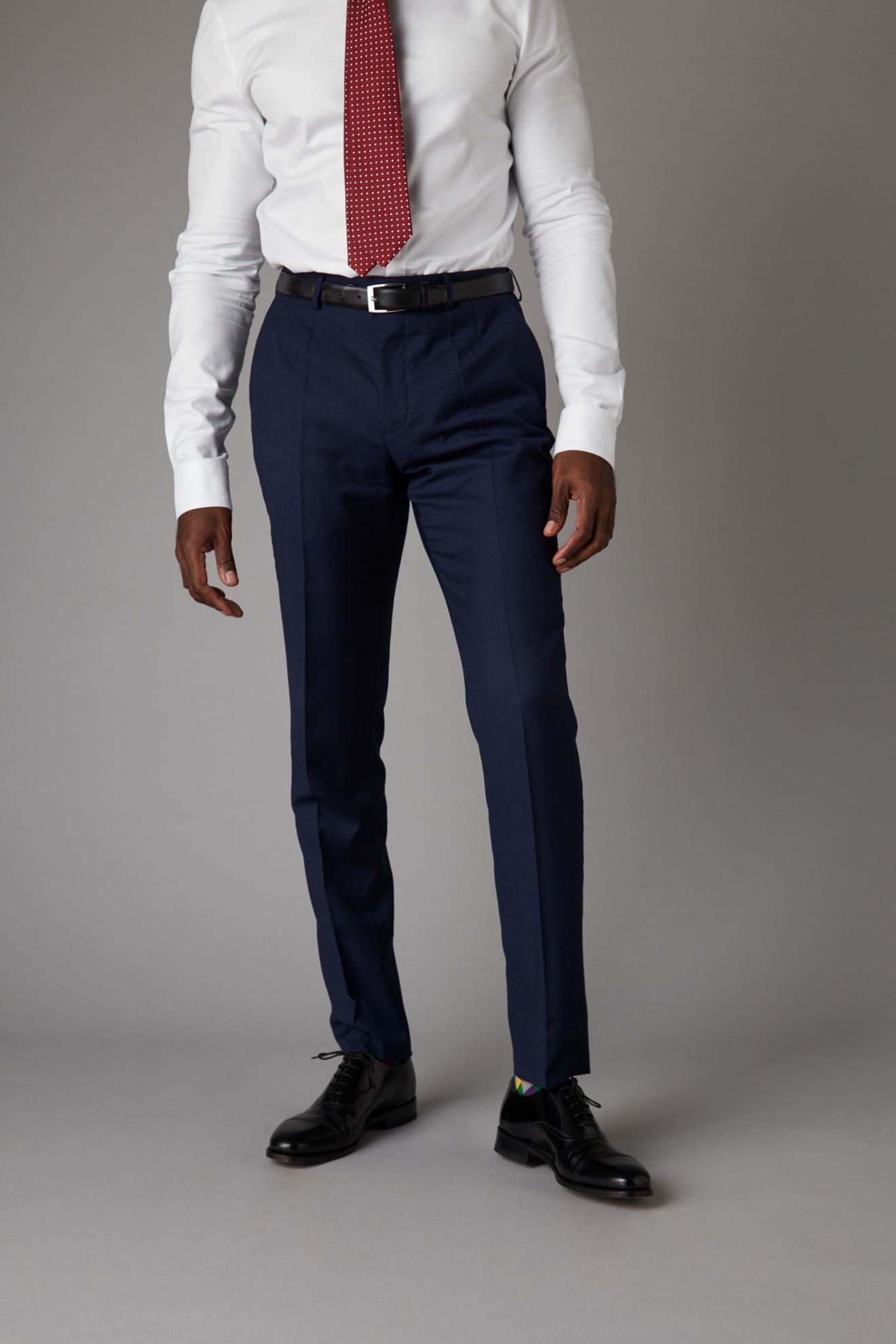 Navy trousers finished with silver buckle side adjusters for that great fit.